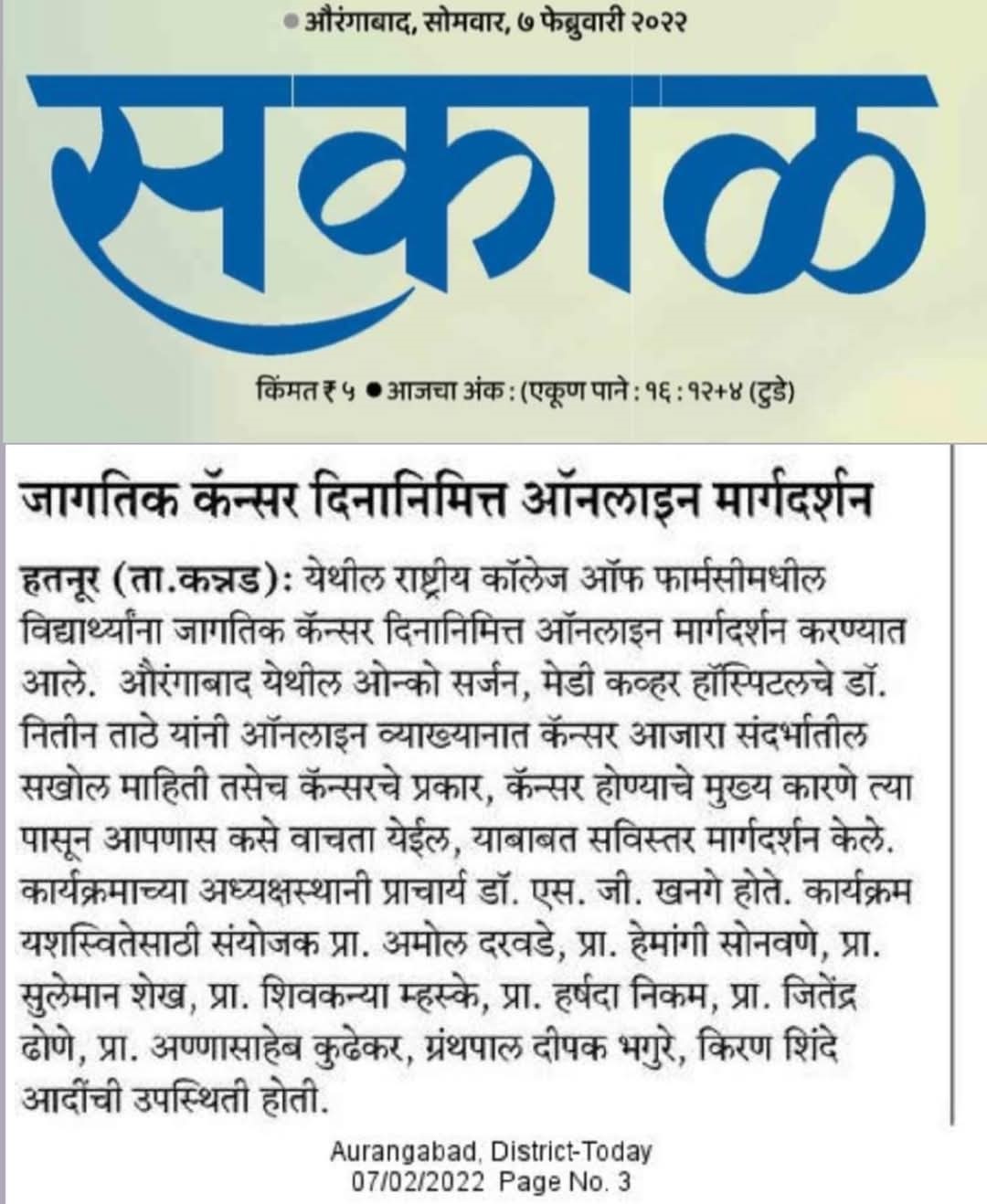 Hatnur Tq. Kannad, Dist. Aurangabad - 431103